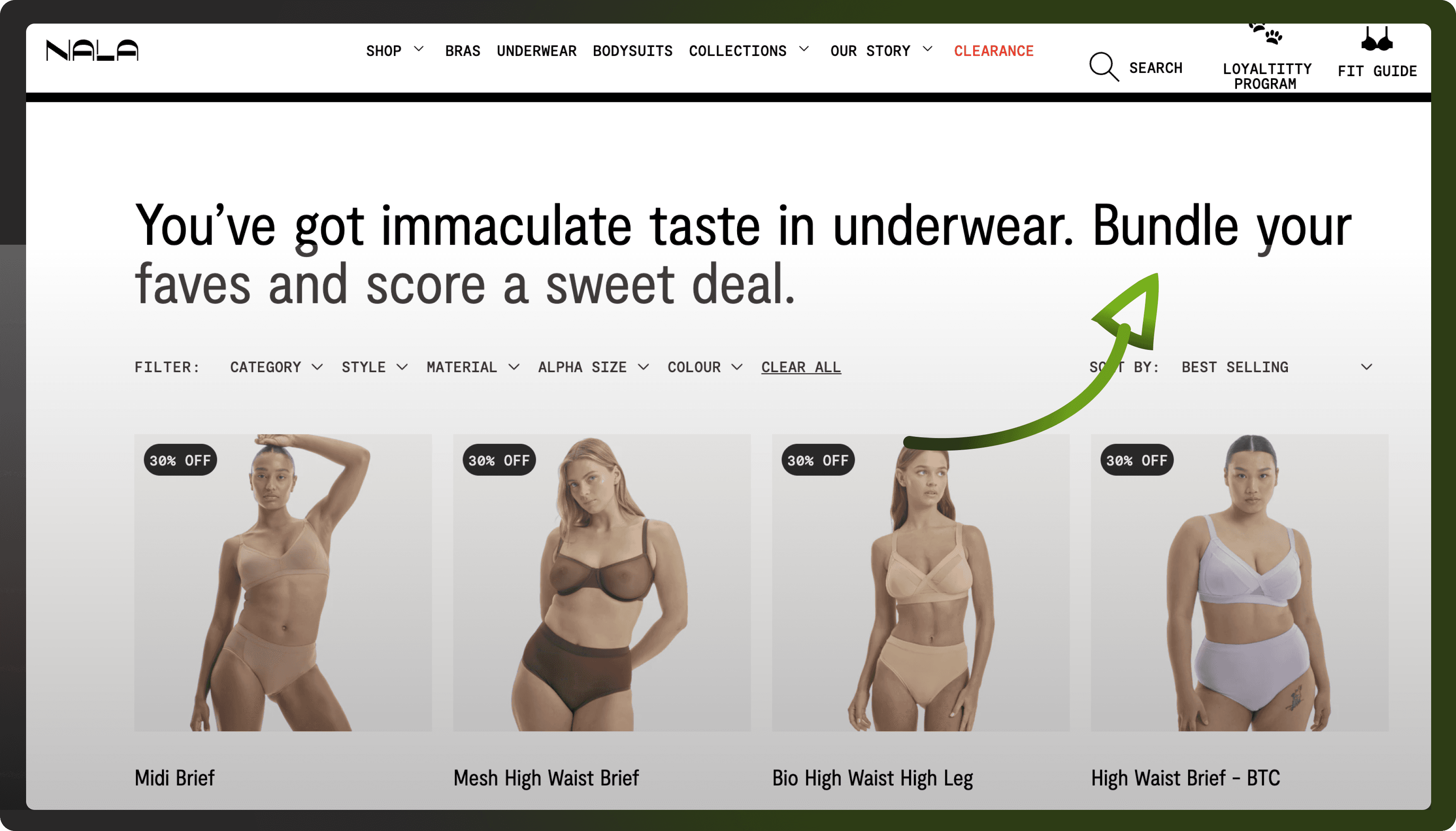 When Nala introduced this approach with their interactive bundle builder for underwear, 10% of their sales started coming from bundles—letting customers mix and match designs and sizes just like they would in a physical store.